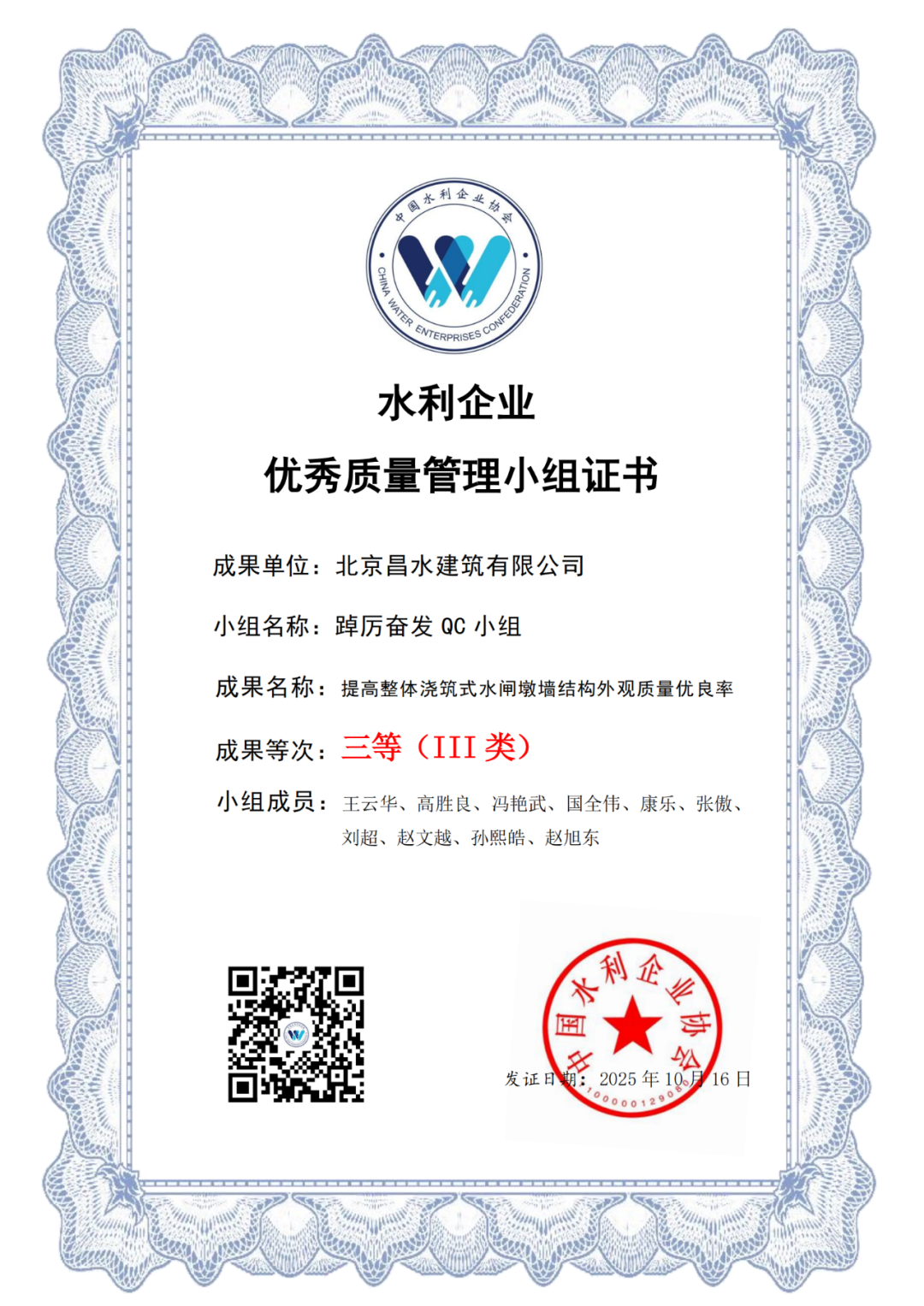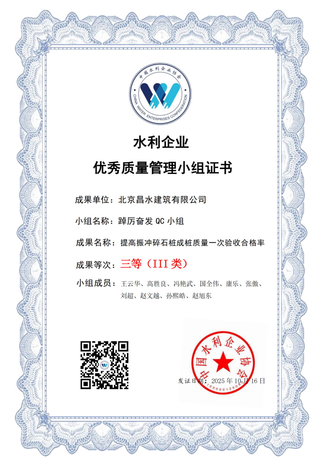 近日,中国水利企业协会公布了2025年度水利企业质量管理小组竞赛活动结果,北京昌水建筑有限公司(以下简称“昌水公司”)申报的“提高振冲碎石桩成桩质量一次验收合格率”与“提高整体浇筑式水闸墩墙结构外观质量优良率”两项QC小组活动成果双双荣获三等奖。